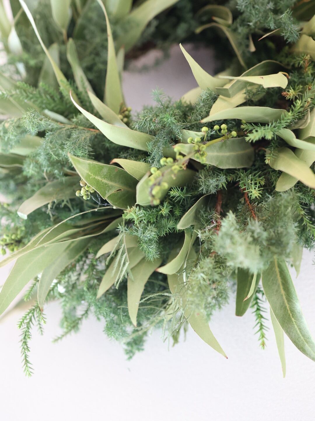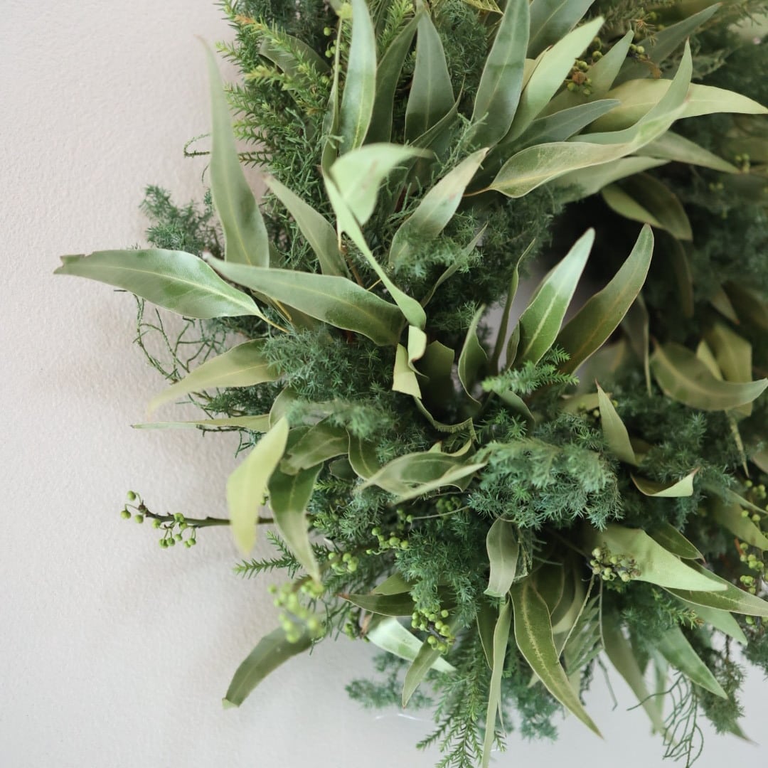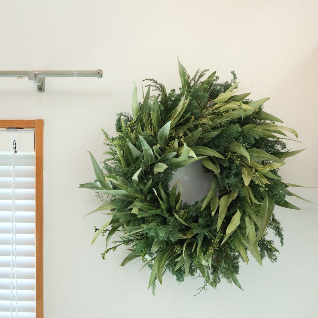 ヒムロスギ、ユーカリ、アオモジを使ったクリスマスにも、クリスマスが終わっても楽しんでいただけるリースです、